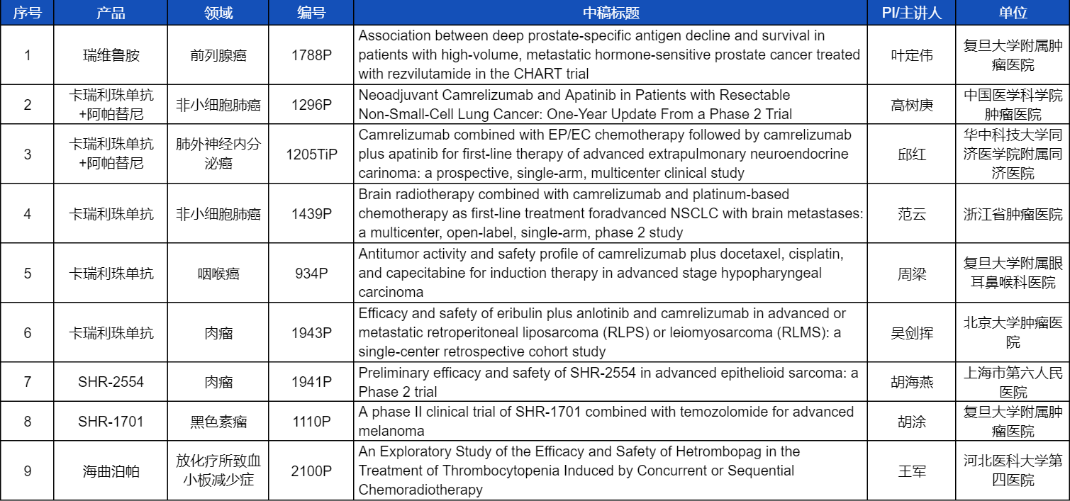 在非小细胞肺癌、咽喉癌、肉瘤、前列腺癌、黑色素瘤等多个领域,卡瑞利珠单抗、阿帕替尼、瑞维鲁胺、SHR-1701、SHR2554等创新产品相关研究一共入选了8项壁报展示。此外,DB真人医药自主研发的血小板生成素受体激动剂(TPO-RA)海曲泊帕在放化疗所致血小板减少领域的探索性研究显示良好的疗效,入选壁报展示。
